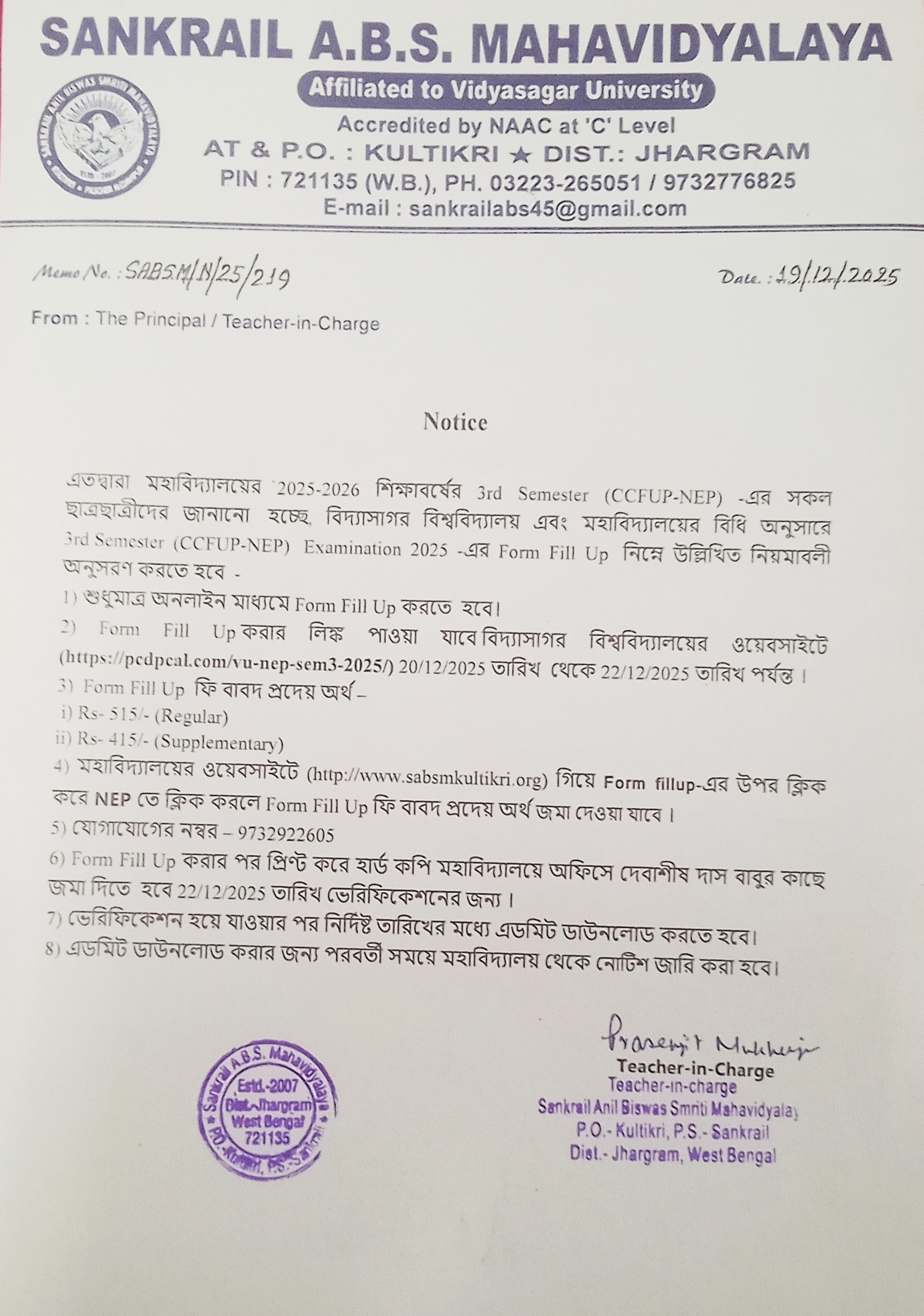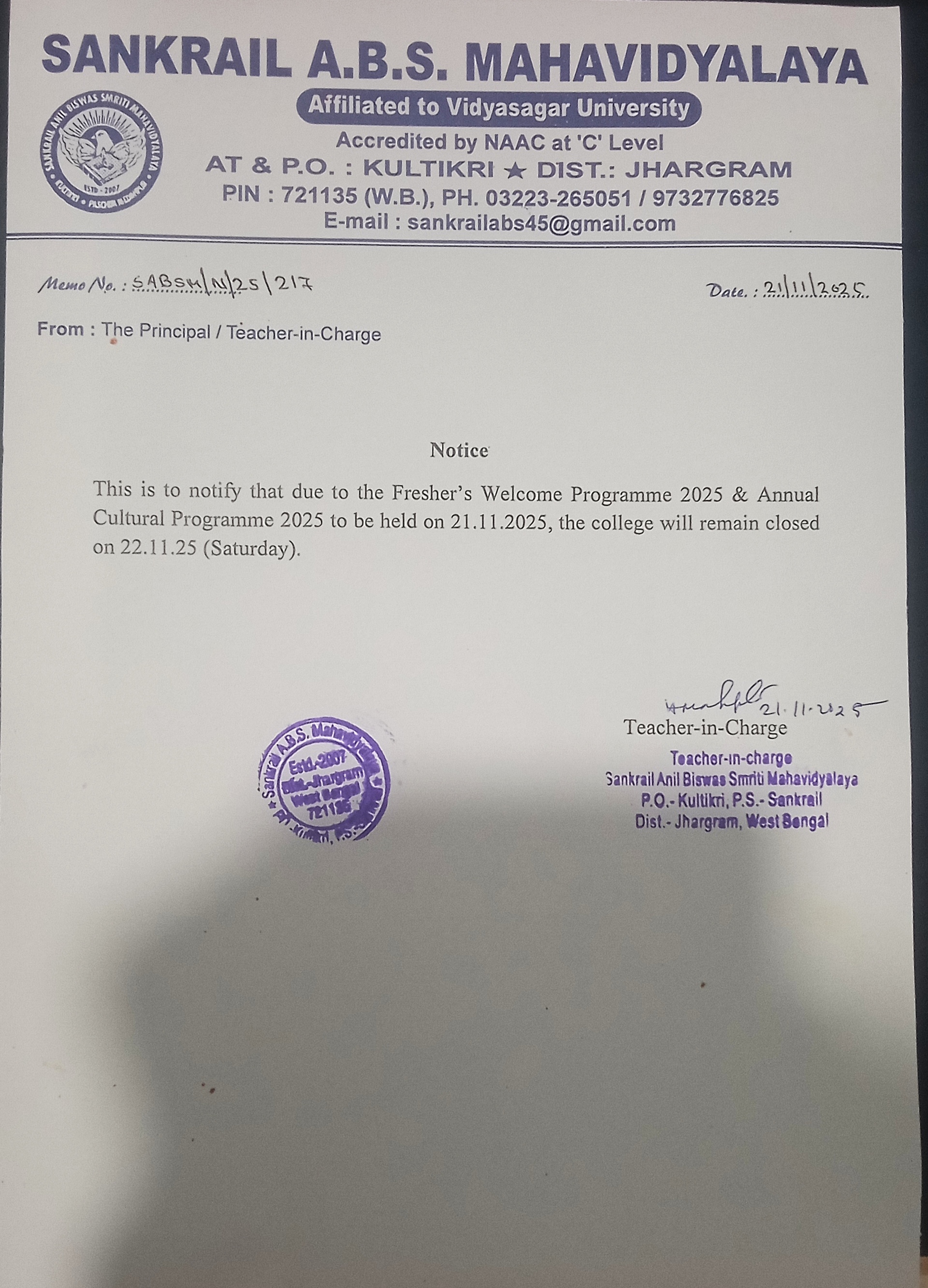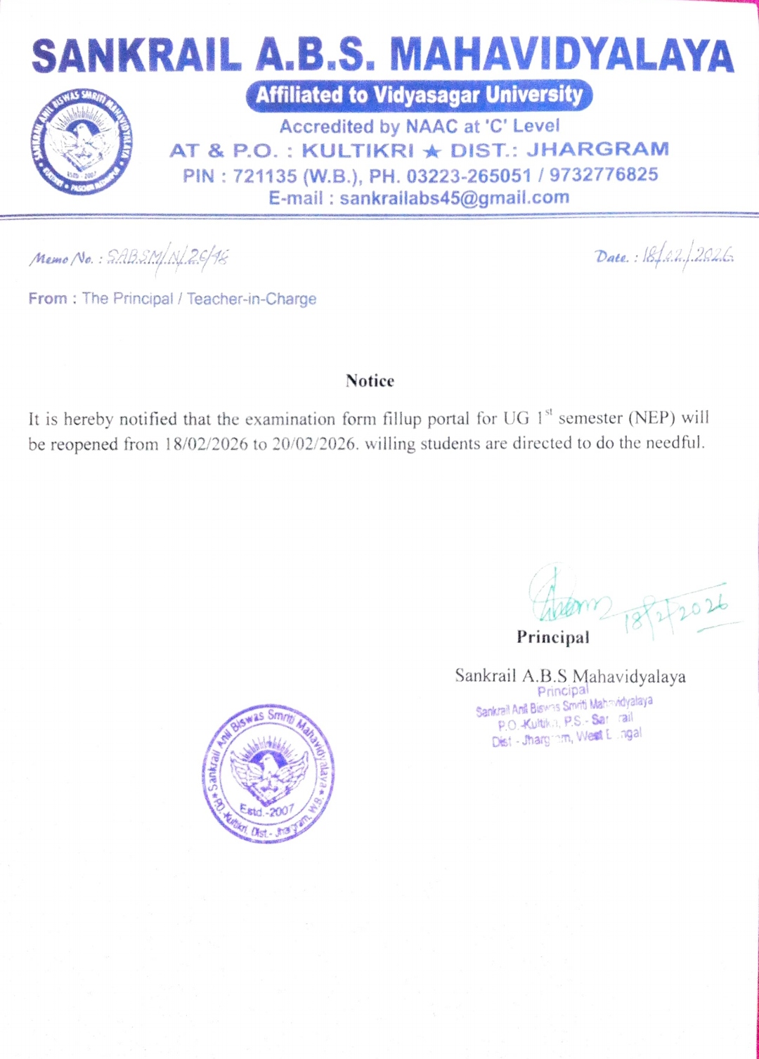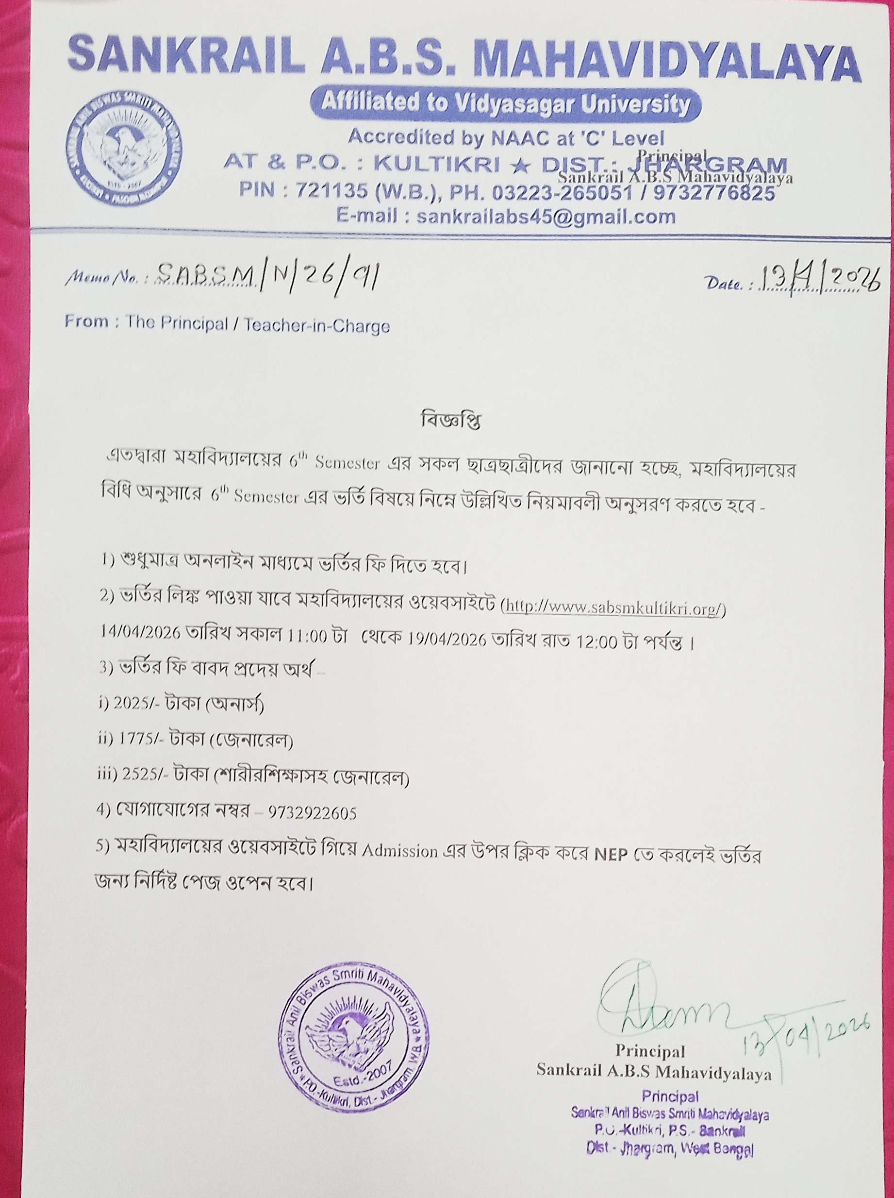 Nestled amidst the natural beauty of Jhargram, the college operates from a sprawling, eco-friendly campus that blends modern infrastructure with a serene learning environment. It offers a diverse range of undergraduate programs in Arts and Science, structured under the Choice-Based Credit System (CBCS) and the National Education Policy (NEP-2020) frameworks. Students can pursue 3-year and 4-year Honours/Honours with Research degrees, as well as multidisciplinary programs, in subjects such as Bengali, English, Sanskrit, History, Political Science, Santali, Education, Physics, Chemistry, Mathematics, Geography, and more.