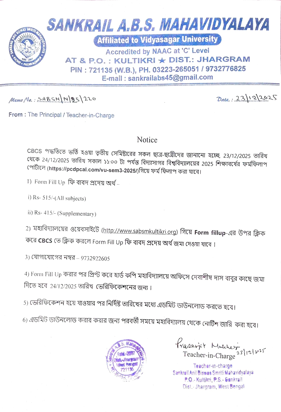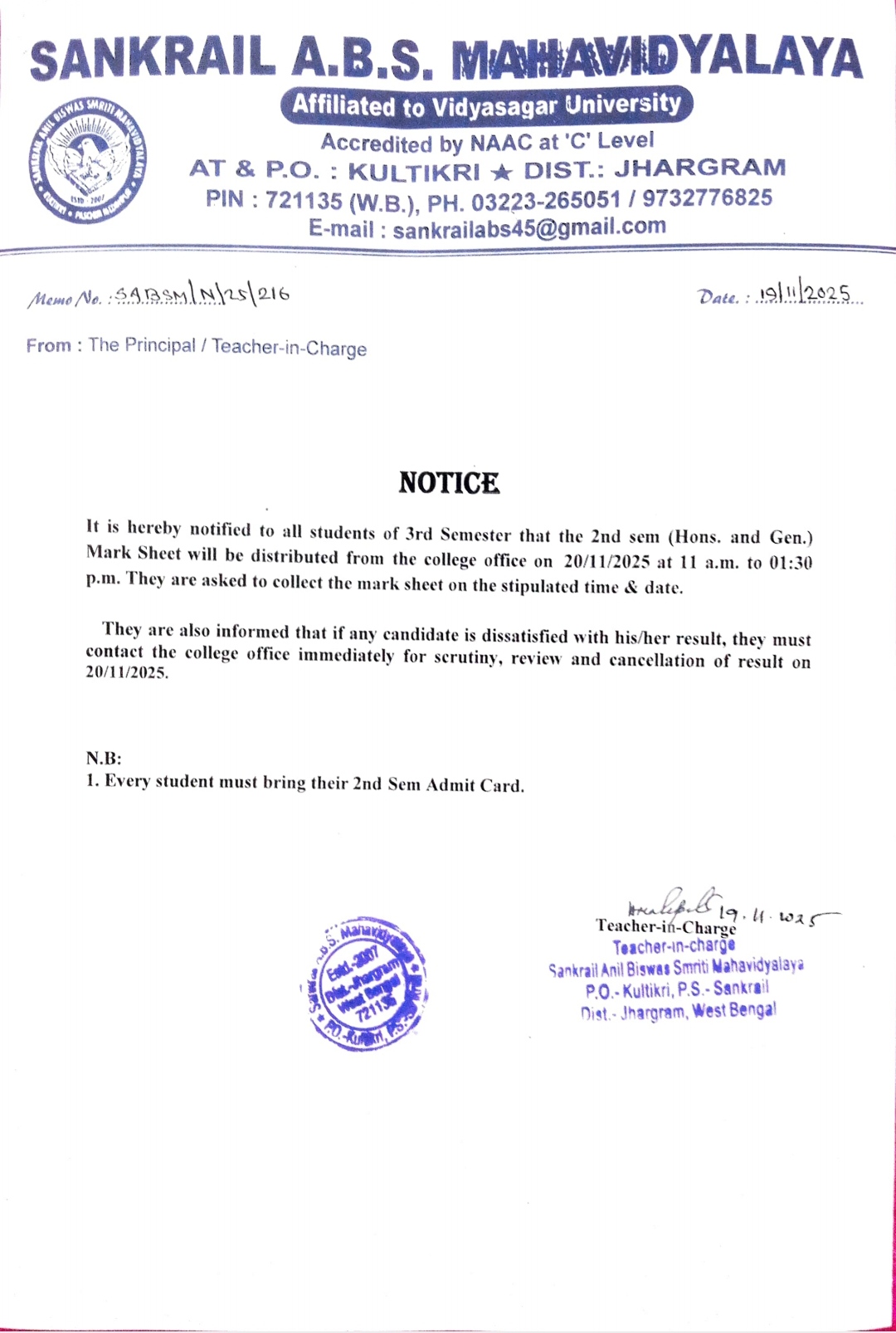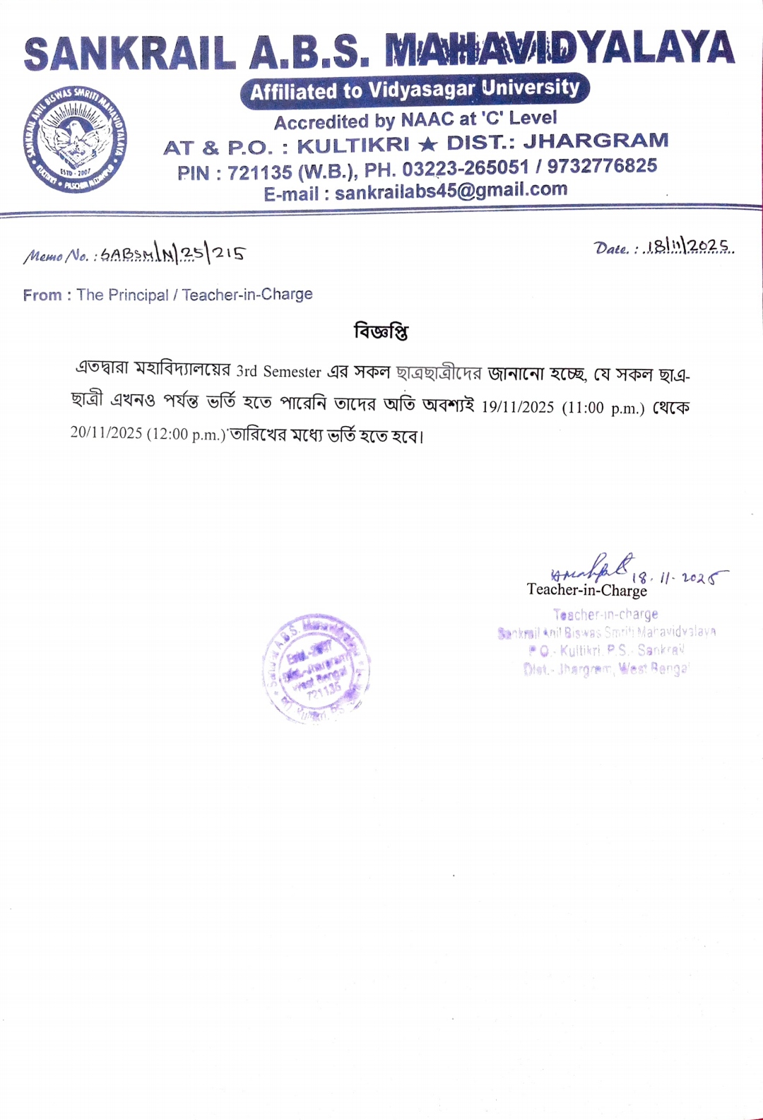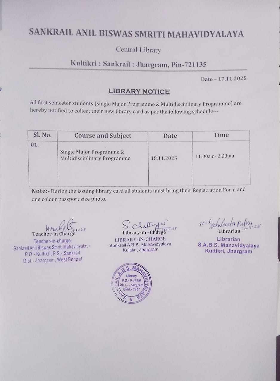 Nestled amidst the natural beauty of Jhargram, the college operates from a sprawling, eco-friendly campus that blends modern infrastructure with a serene learning environment. It offers a diverse range of undergraduate programs in Arts and Science, structured under the Choice-Based Credit System (CBCS) and the National Education Policy (NEP-2020) frameworks. Students can pursue 3-year and 4-year Honours/Honours with Research degrees, as well as multidisciplinary programs, in subjects such as Bengali, English, Sanskrit, History, Political Science, Santali, Education, Physics, Chemistry, Mathematics, Geography, and more.