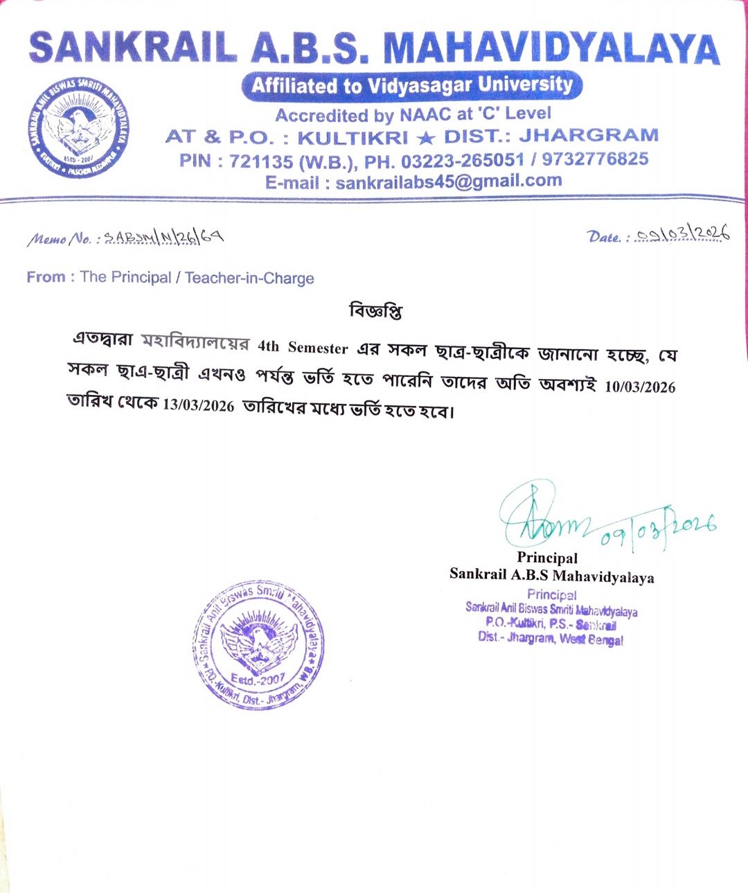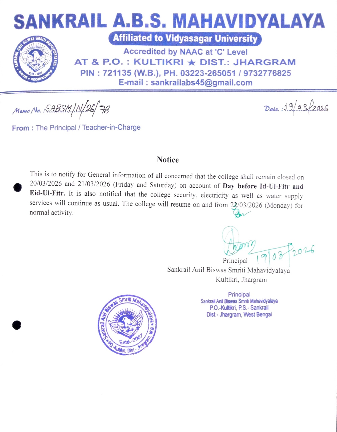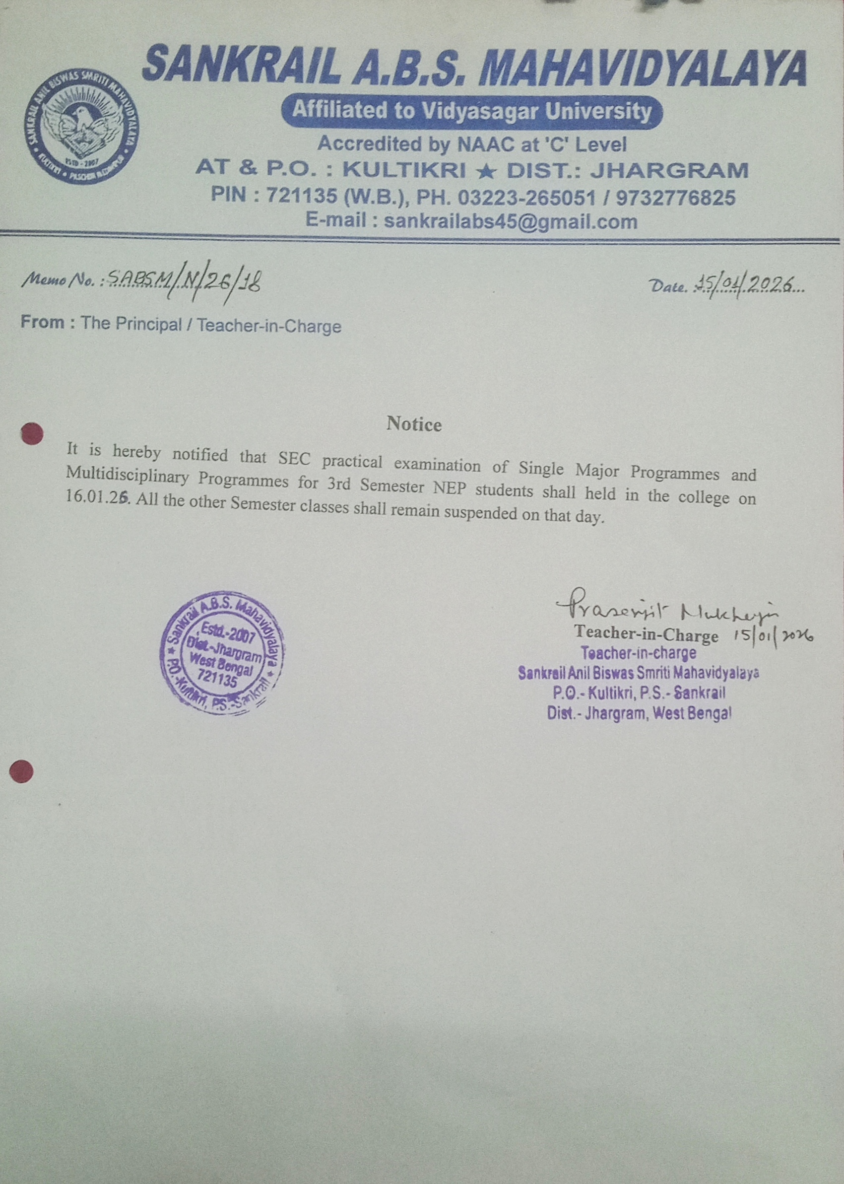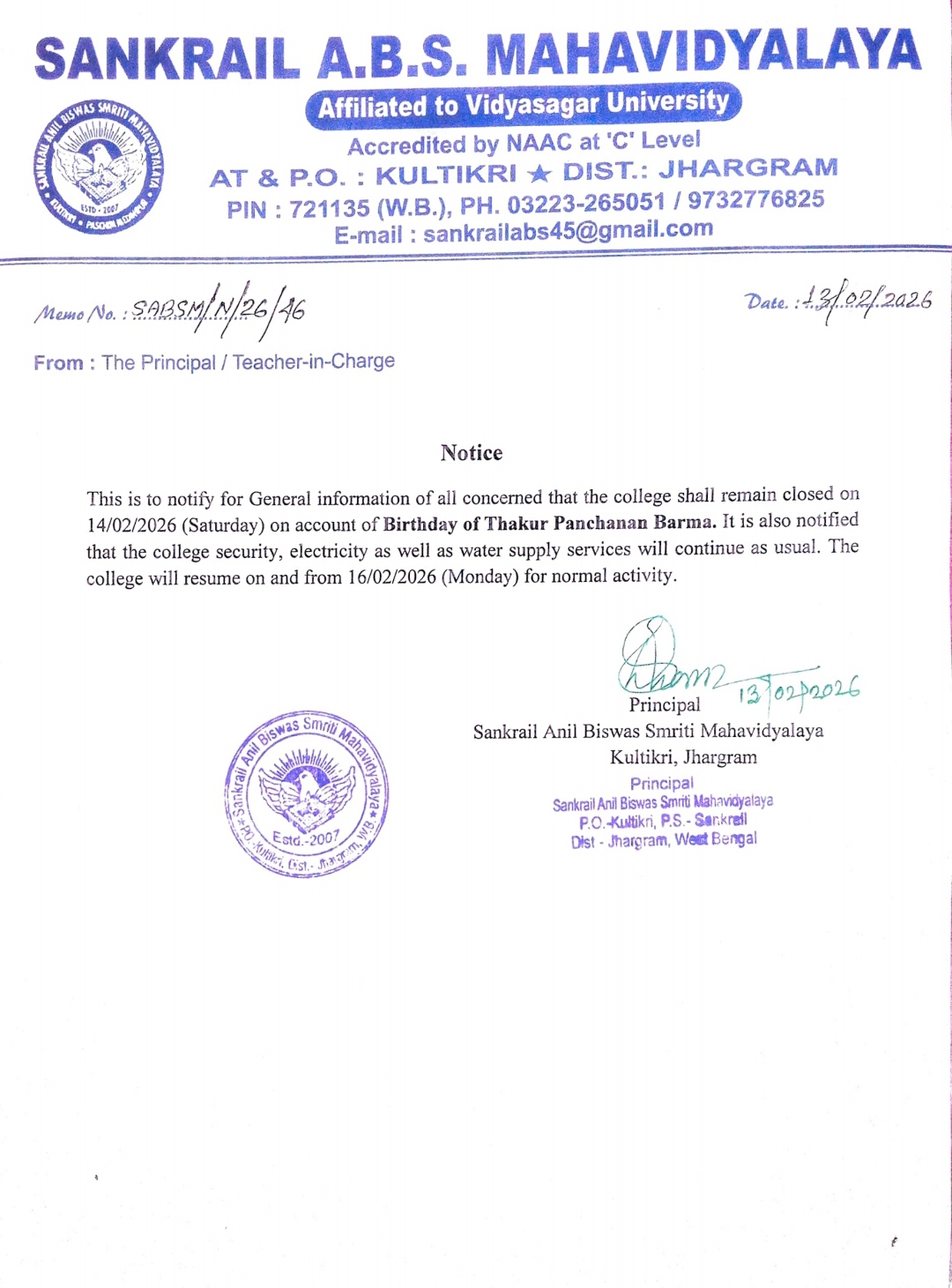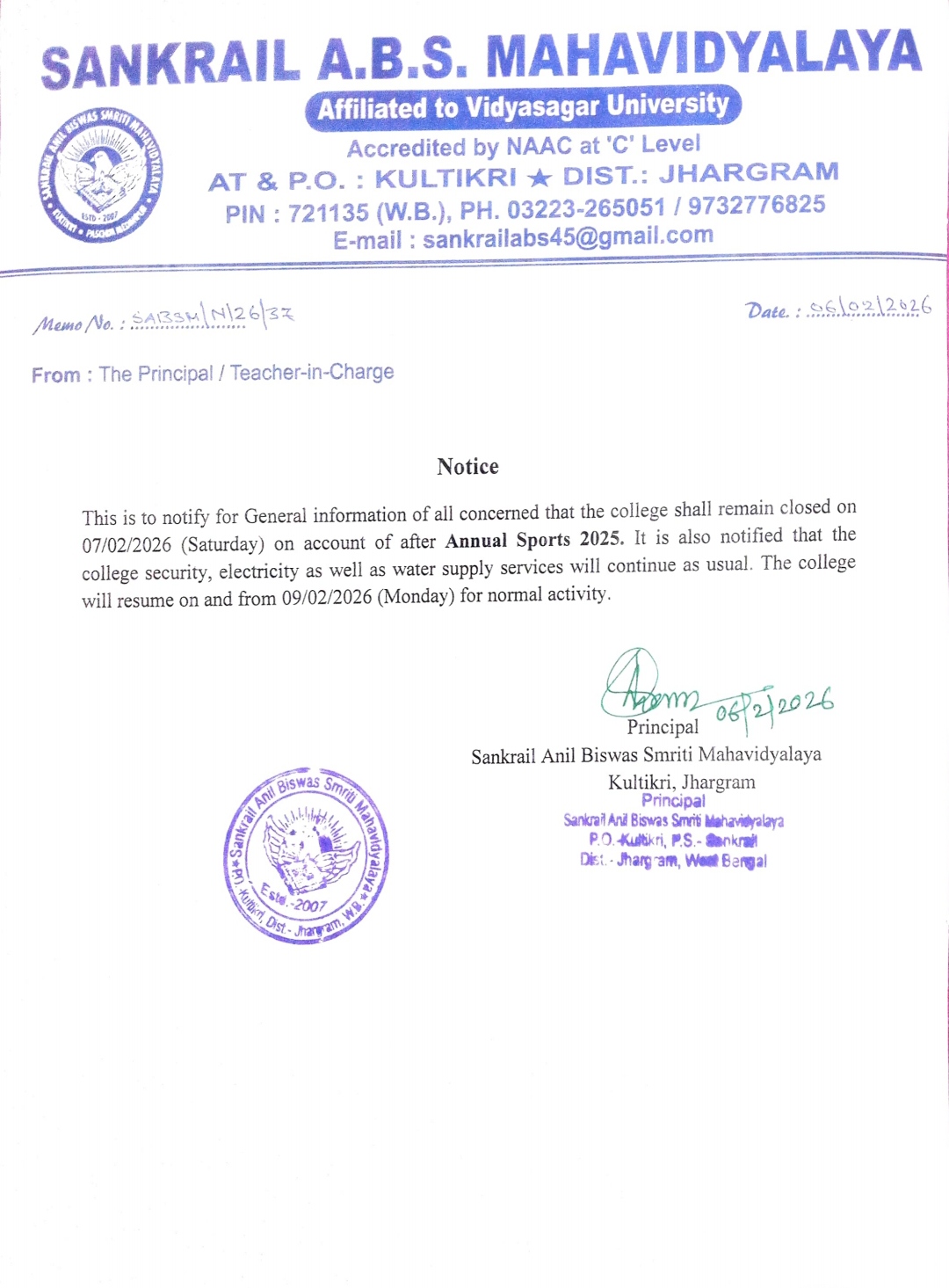 Sankrail Anil Biswas Smriti Mahavidyalaya, situated in the verdant village of Kultikri, Jhargram, West Bengal, is a NAAC-accredited institution affiliated with Vidyasagar University. Established in 2007, the college was founded with a mission to provide accessible, quality higher education to first-generation learners, particularly from Scheduled Castes, Scheduled Tribes, and Other Backward Classes in the Jungle Mahal region. Named after the esteemed social worker Anil Biswas, the institution embodies a commitment to empowering marginalized communities through academic excellence and holistic development.