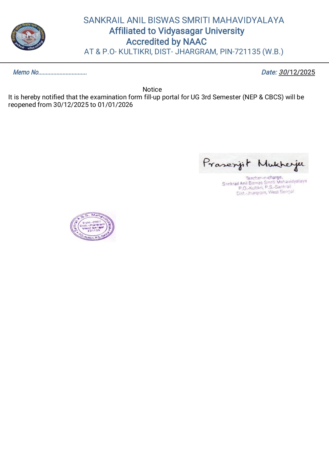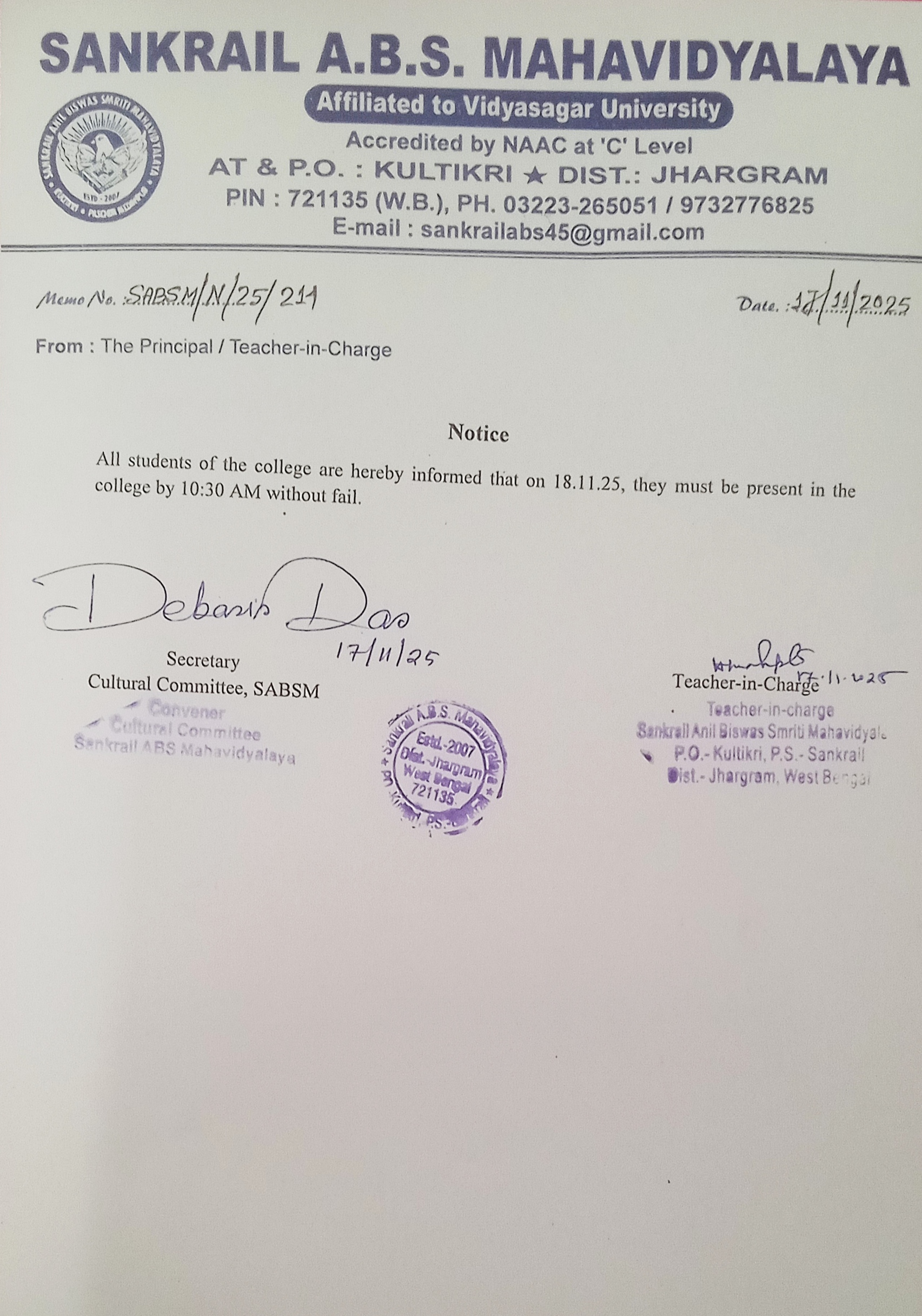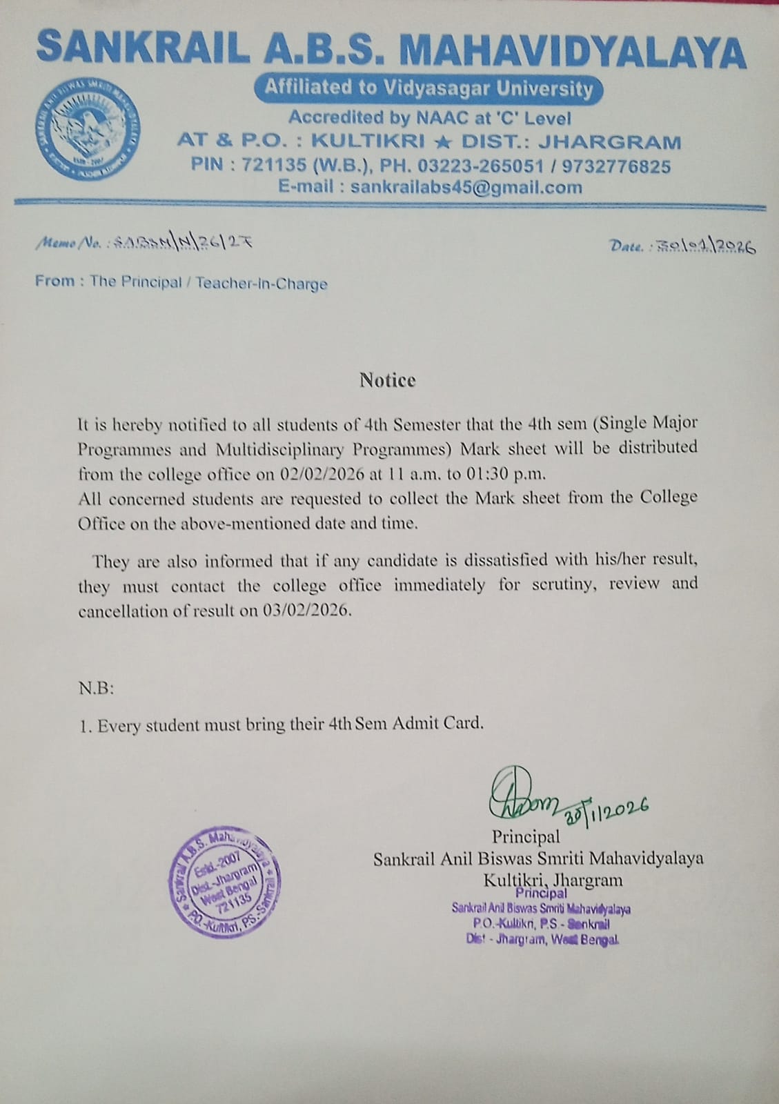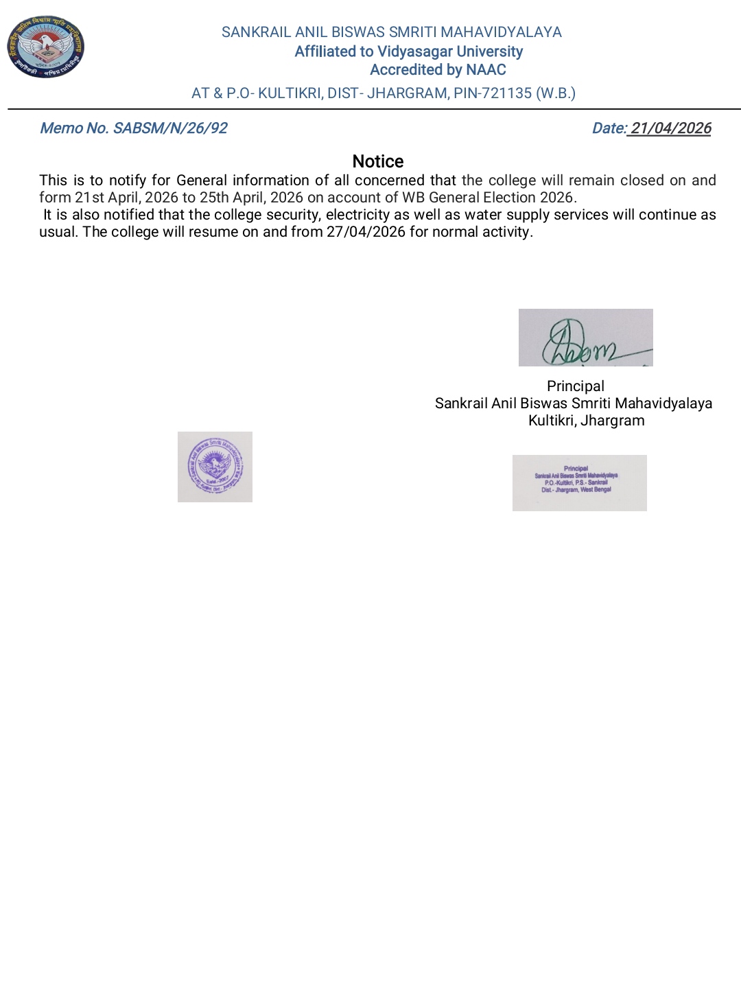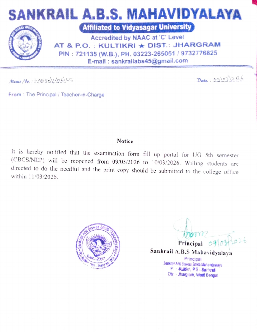 Sankrail Anil Biswas Smriti Mahavidyalaya, situated in the verdant village of Kultikri, Jhargram, West Bengal, is a NAAC-accredited institution affiliated with Vidyasagar University. Established in 2007, the college was founded with a mission to provide accessible, quality higher education to first-generation learners, particularly from Scheduled Castes, Scheduled Tribes, and Other Backward Classes in the Jungle Mahal region. Named after the esteemed social worker Anil Biswas, the institution embodies a commitment to empowering marginalized communities through academic excellence and holistic development.