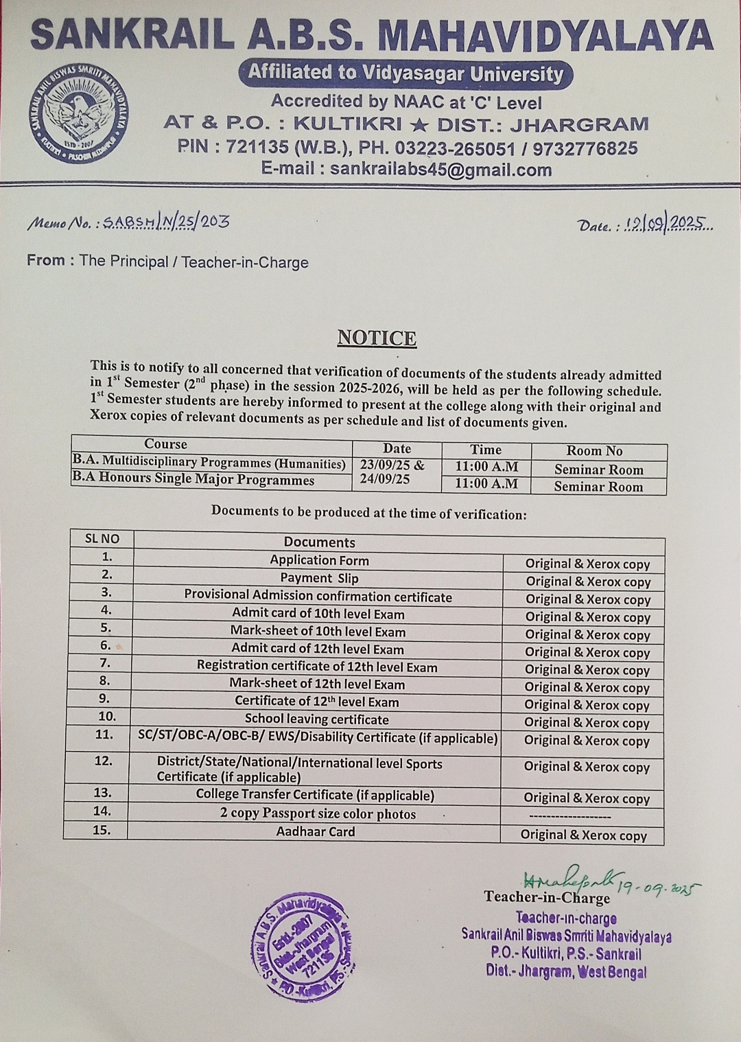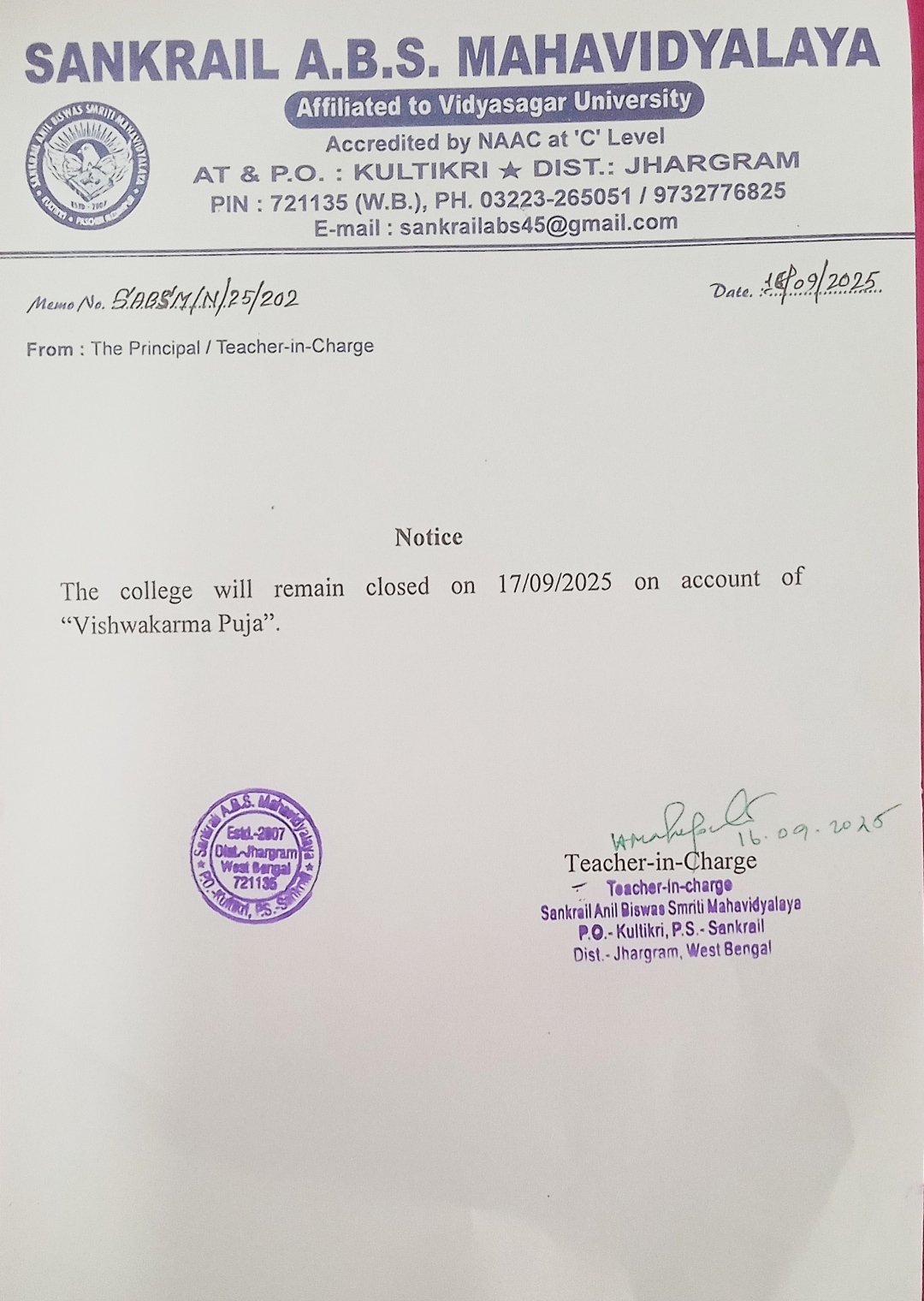Sankrail Anil Biswas Smriti Mahavidyalaya, situated in the verdant village of Kultikri, Jhargram, West Bengal, is a NAAC-accredited institution affiliated with Vidyasagar University. Established in 2007, the college was founded with a mission to provide accessible, quality higher education to first-generation learners, particularly from Scheduled Castes, Scheduled Tribes, and Other Backward Classes in the Jungle Mahal region. Named after the esteemed social worker Anil Biswas, the institution embodies a commitment to empowering marginalized communities through academic excellence and holistic development.