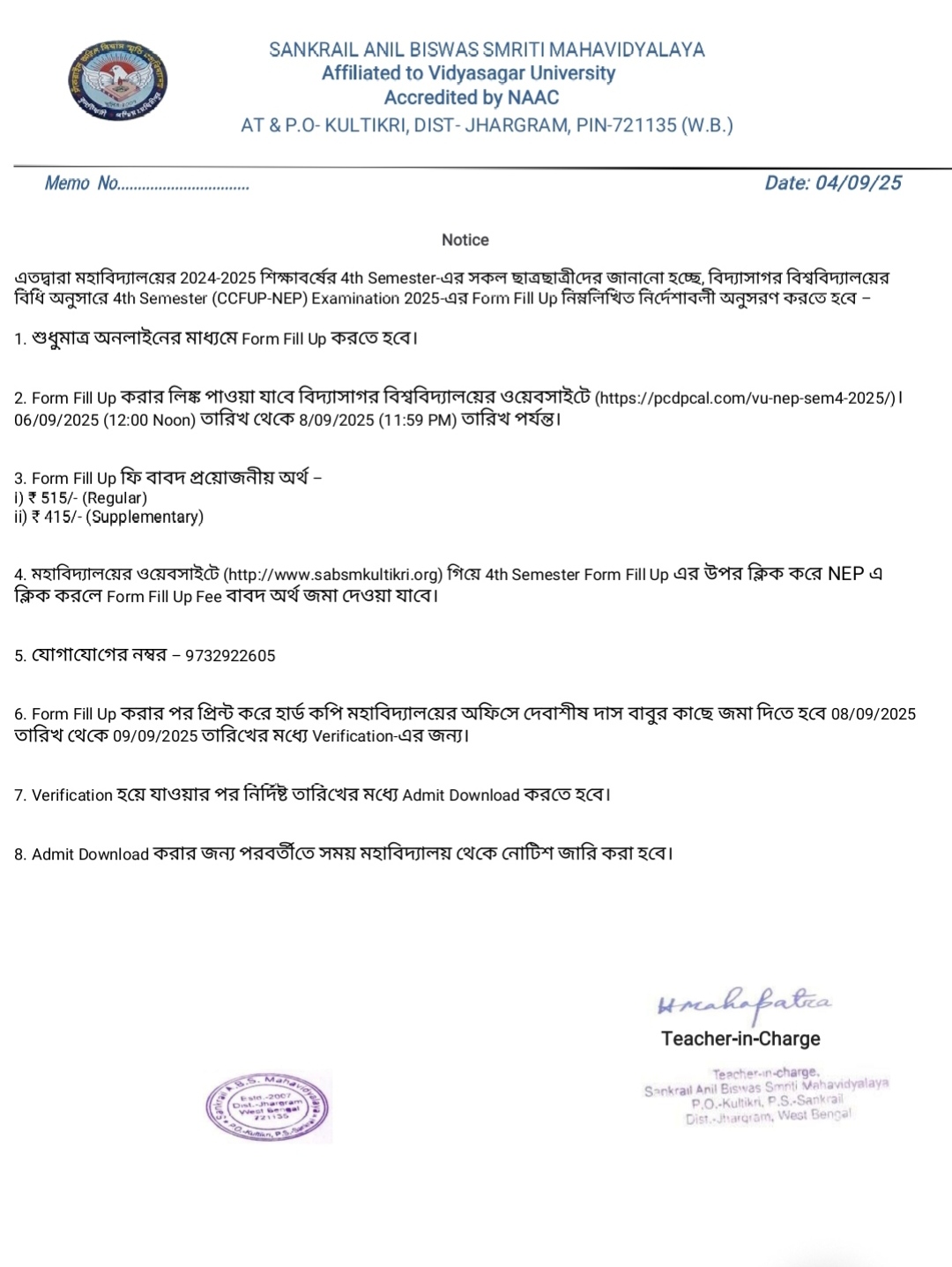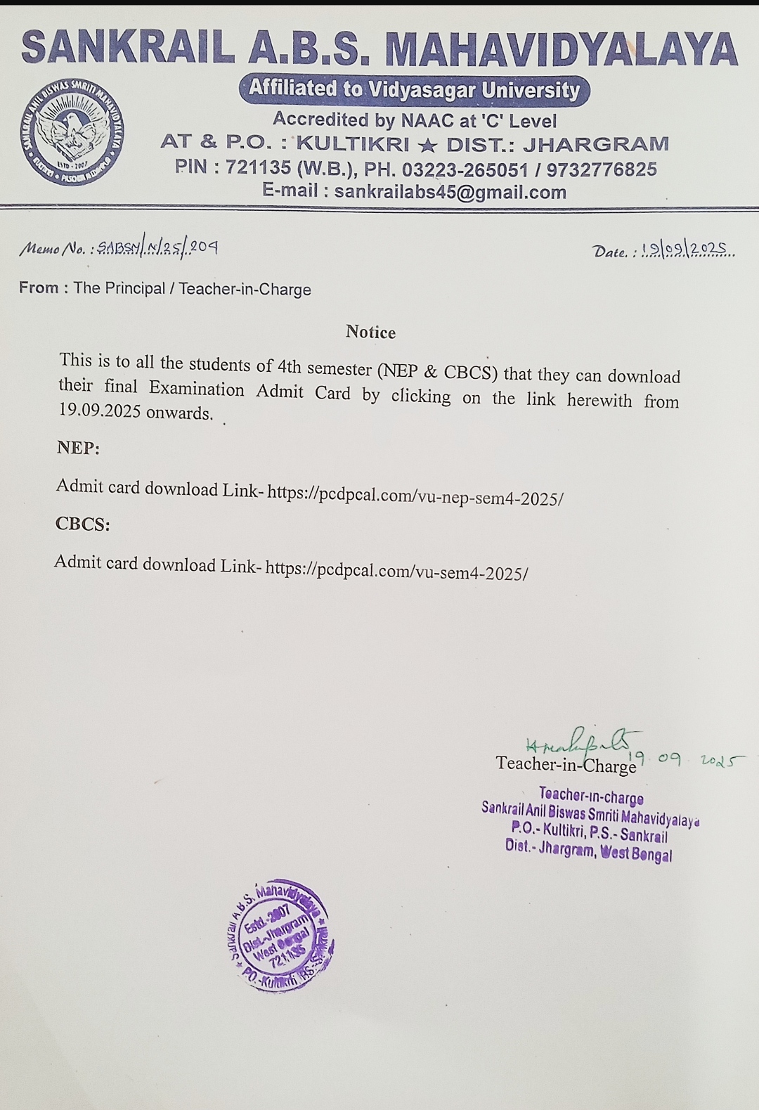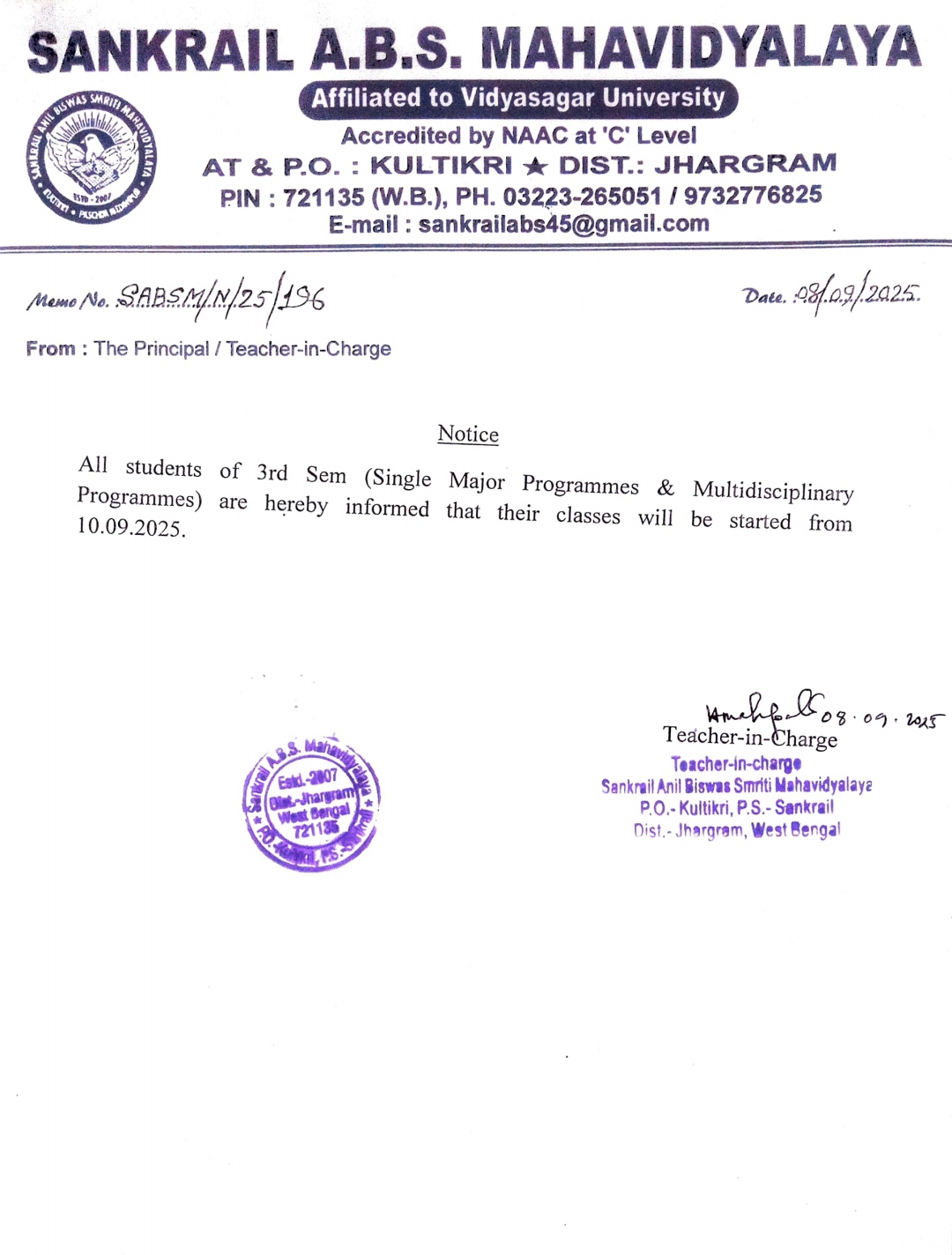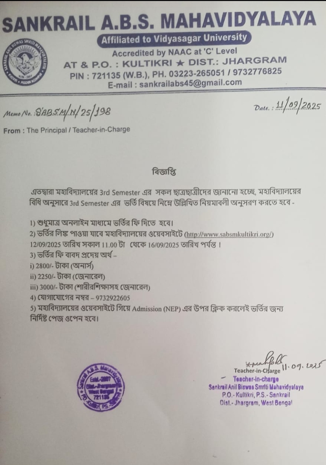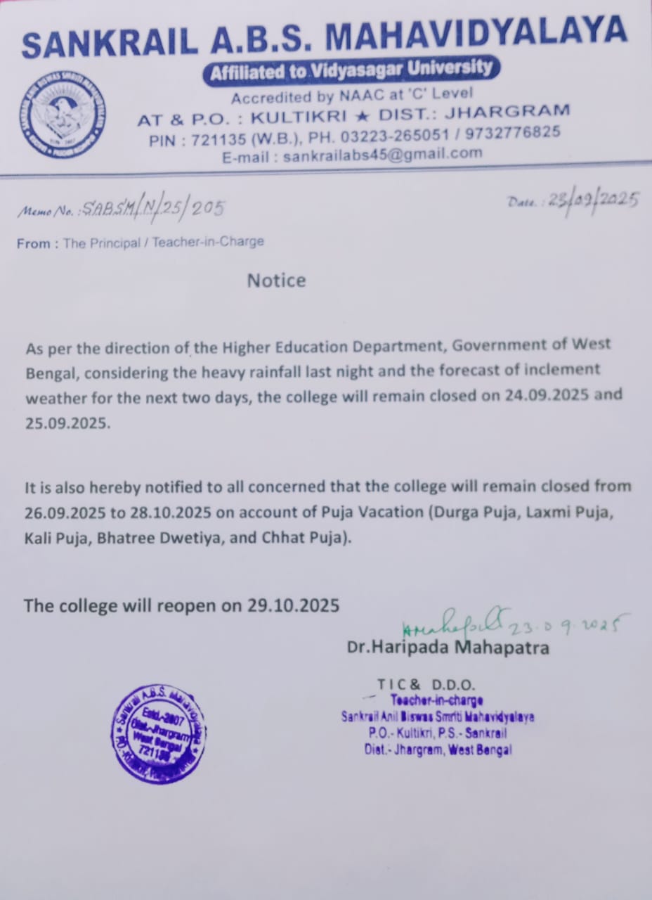 Nestled amidst the natural beauty of Jhargram, the college operates from a sprawling, eco-friendly campus that blends modern infrastructure with a serene learning environment. It offers a diverse range of undergraduate programs in Arts and Science, structured under the Choice-Based Credit System (CBCS) and the National Education Policy (NEP-2020) frameworks. Students can pursue 3-year and 4-year Honours/Honours with Research degrees, as well as multidisciplinary programs, in subjects such as Bengali, English, Sanskrit, History, Political Science, Santali, Education, Physics, Chemistry, Mathematics, Geography, and more.