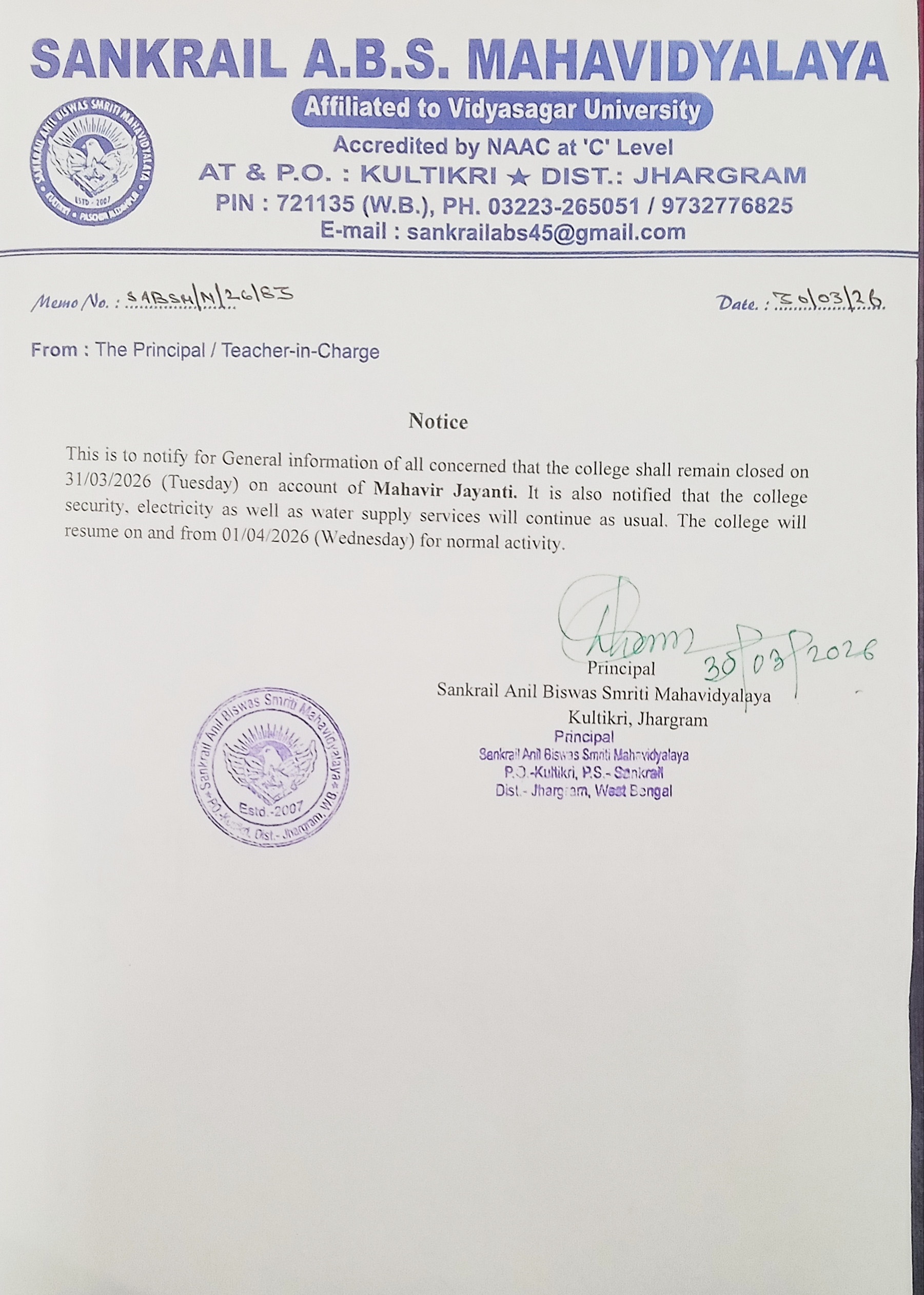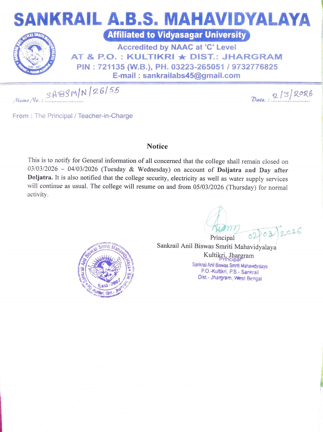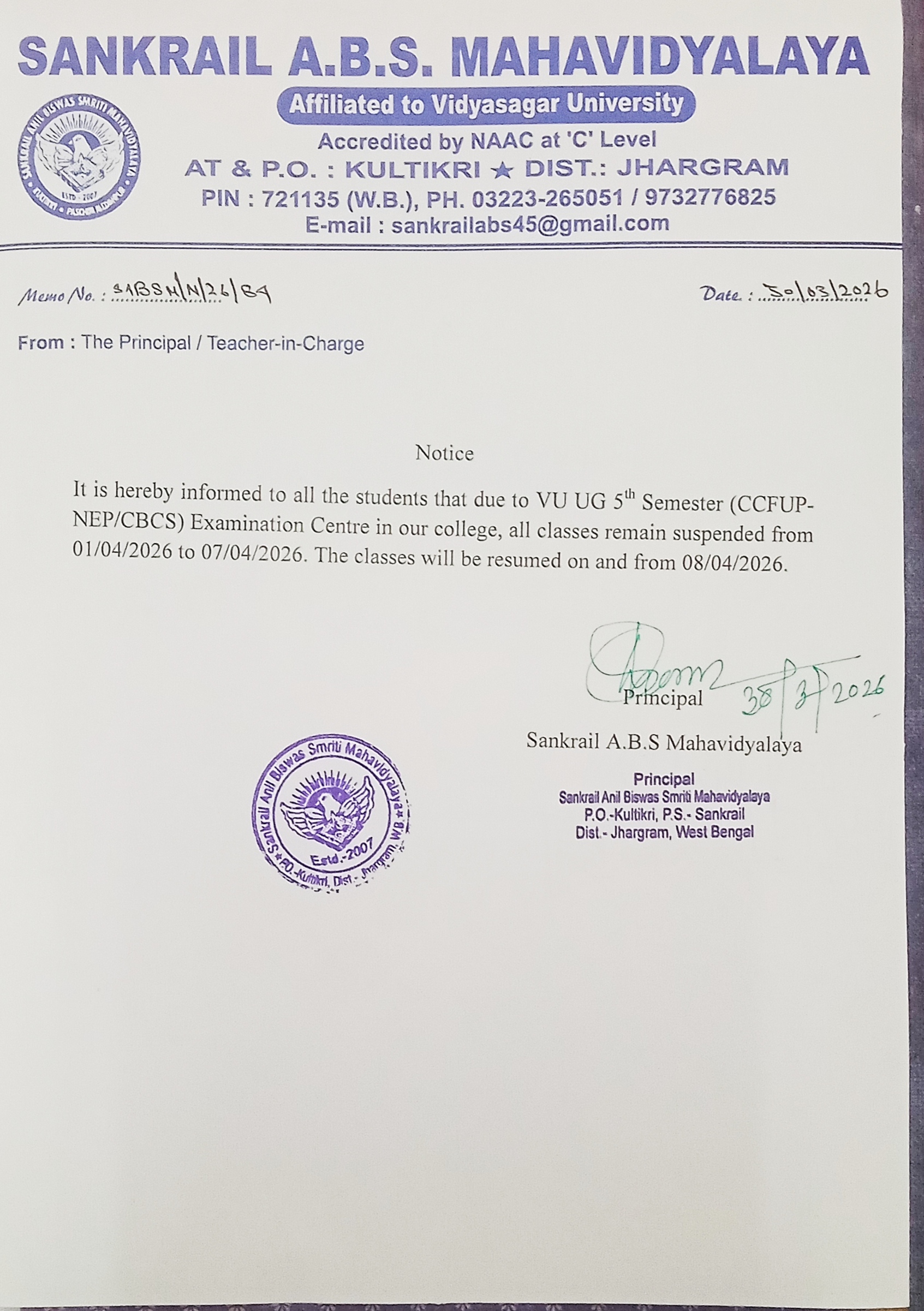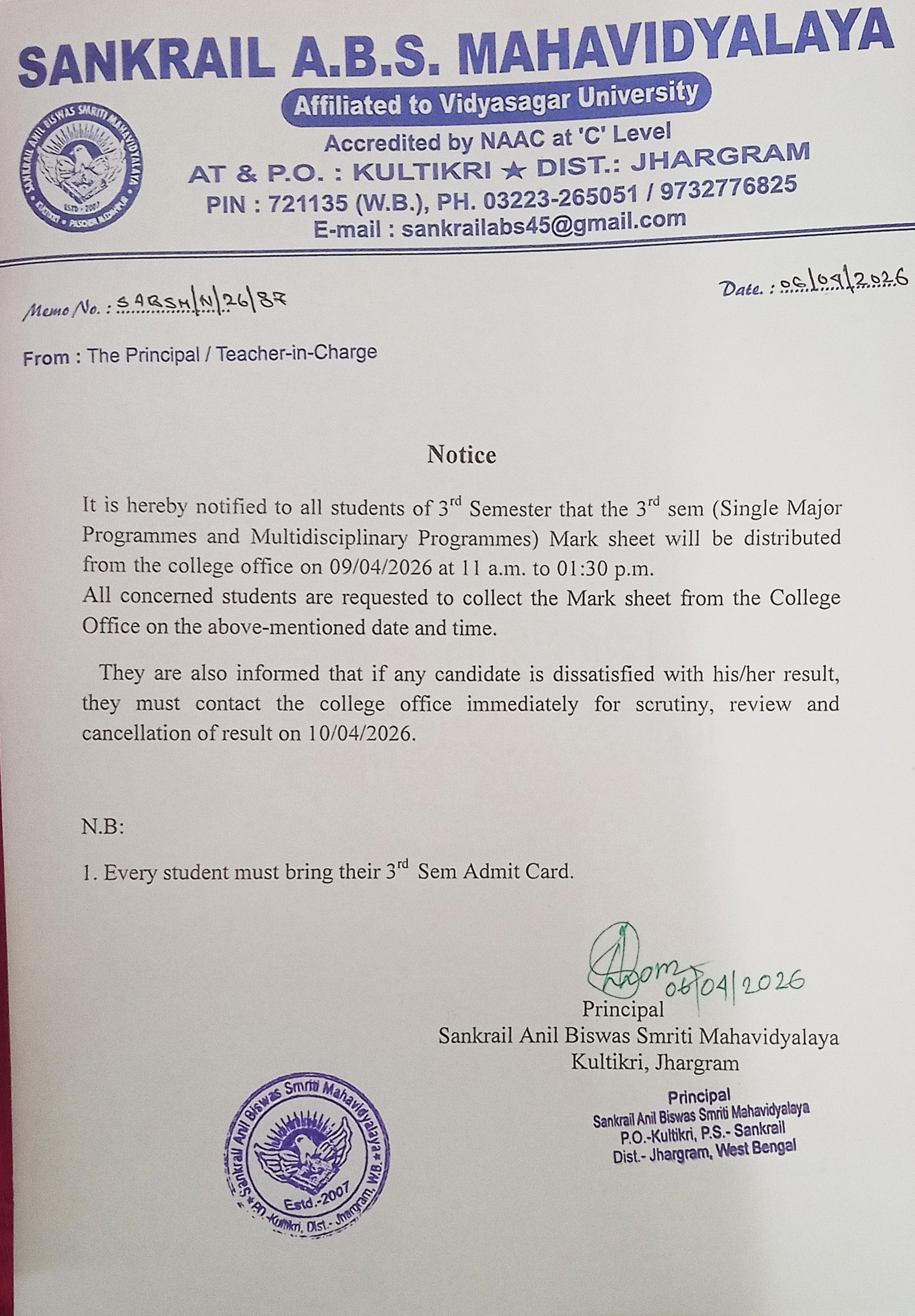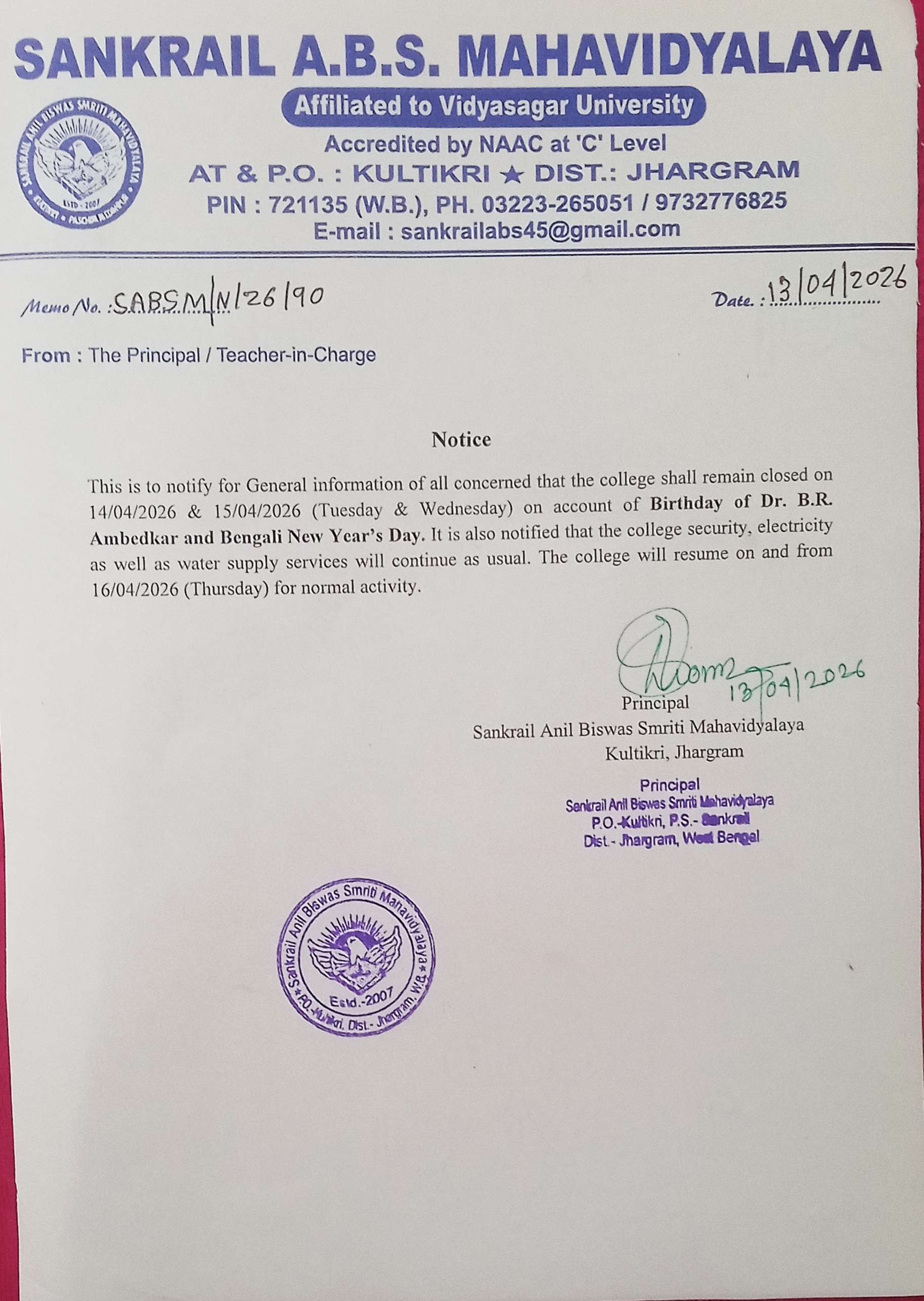 Sankrail Anil Biswas Smriti Mahavidyalaya, situated in the verdant village of Kultikri, Jhargram, West Bengal, is a NAAC-accredited institution affiliated with Vidyasagar University. Established in 2007, the college was founded with a mission to provide accessible, quality higher education to first-generation learners, particularly from Scheduled Castes, Scheduled Tribes, and Other Backward Classes in the Jungle Mahal region. Named after the esteemed social worker Anil Biswas, the institution embodies a commitment to empowering marginalized communities through academic excellence and holistic development.