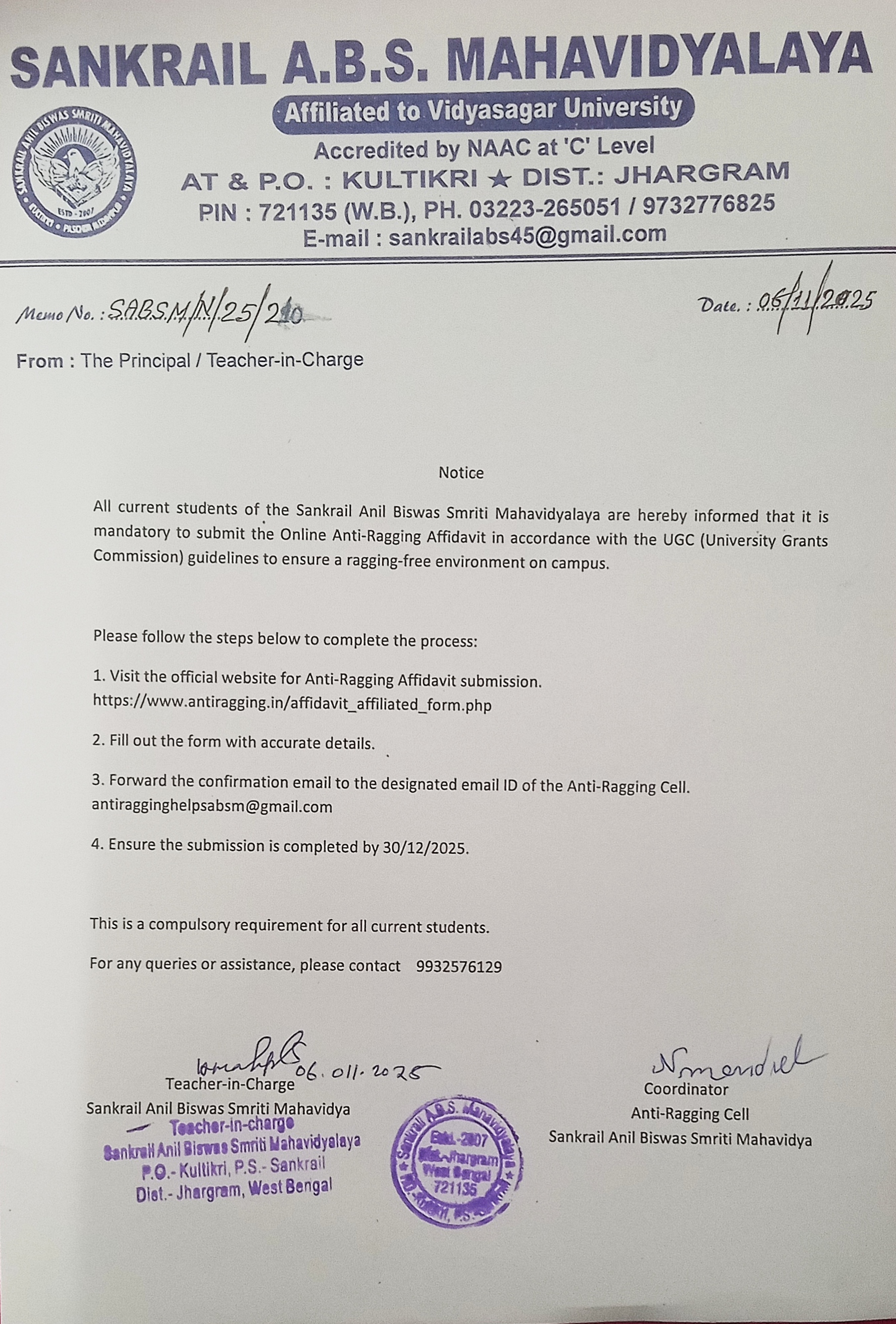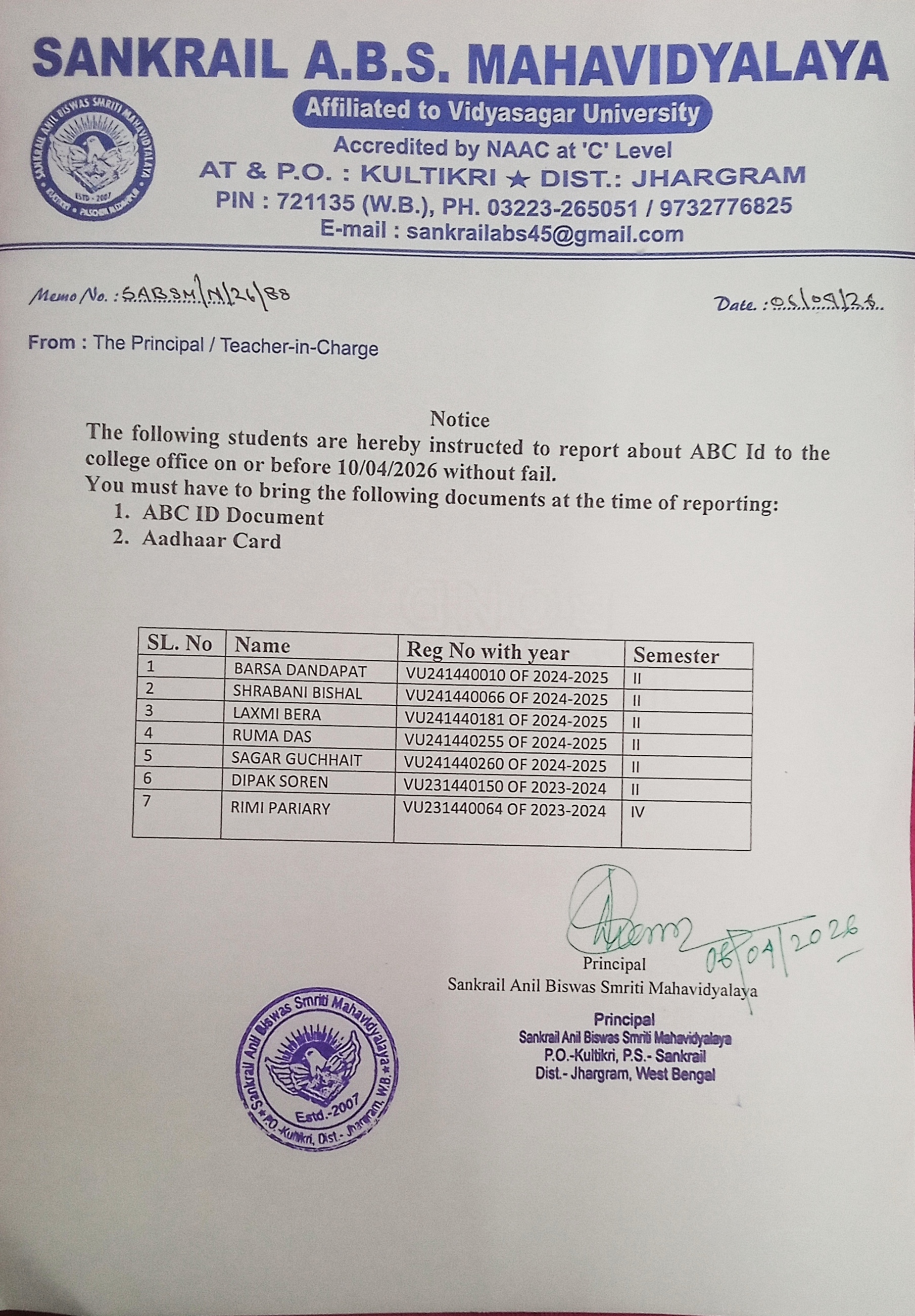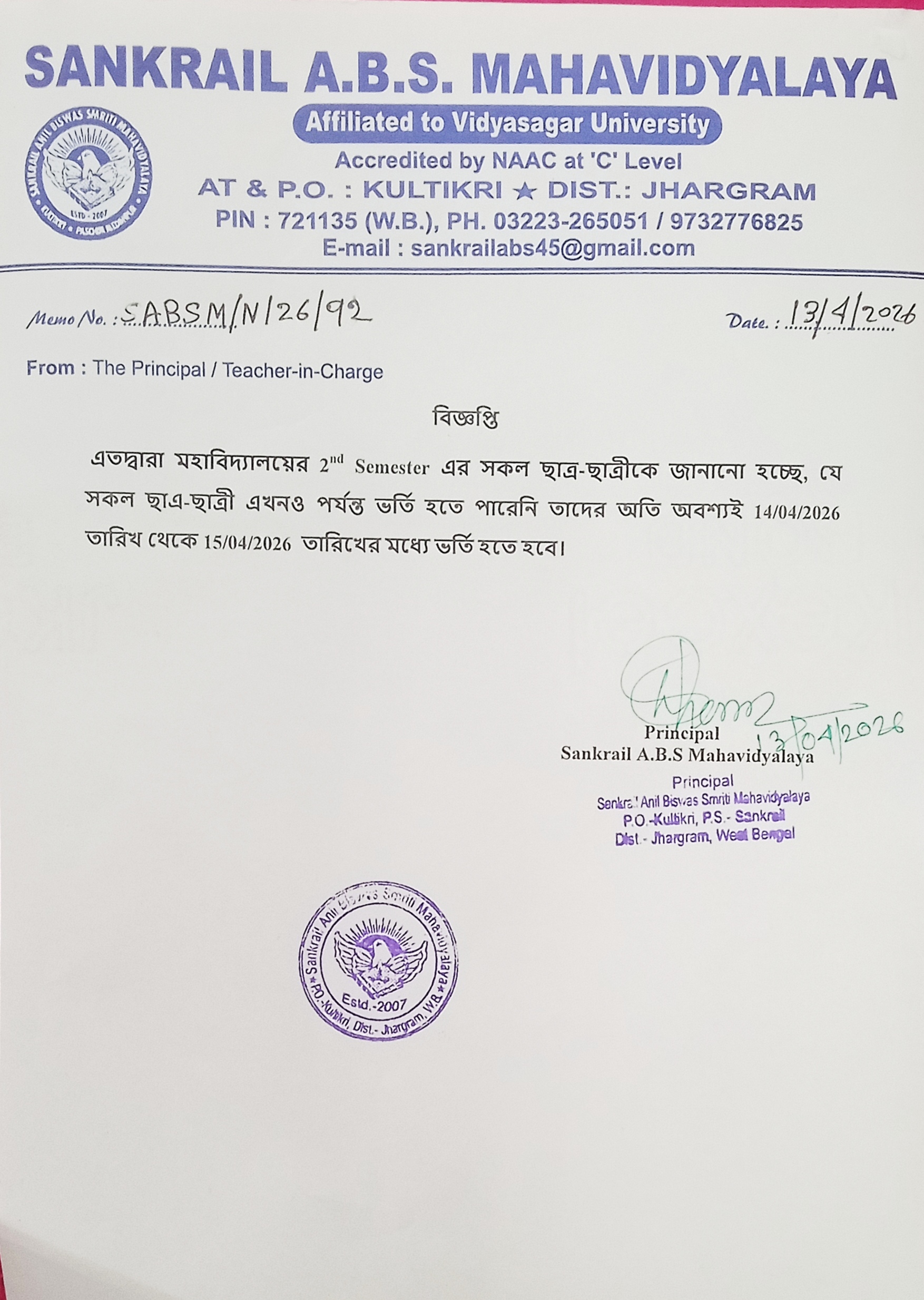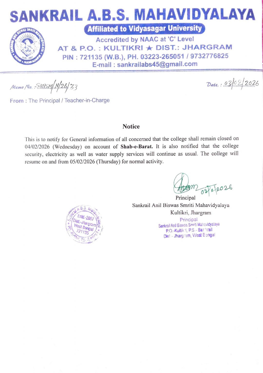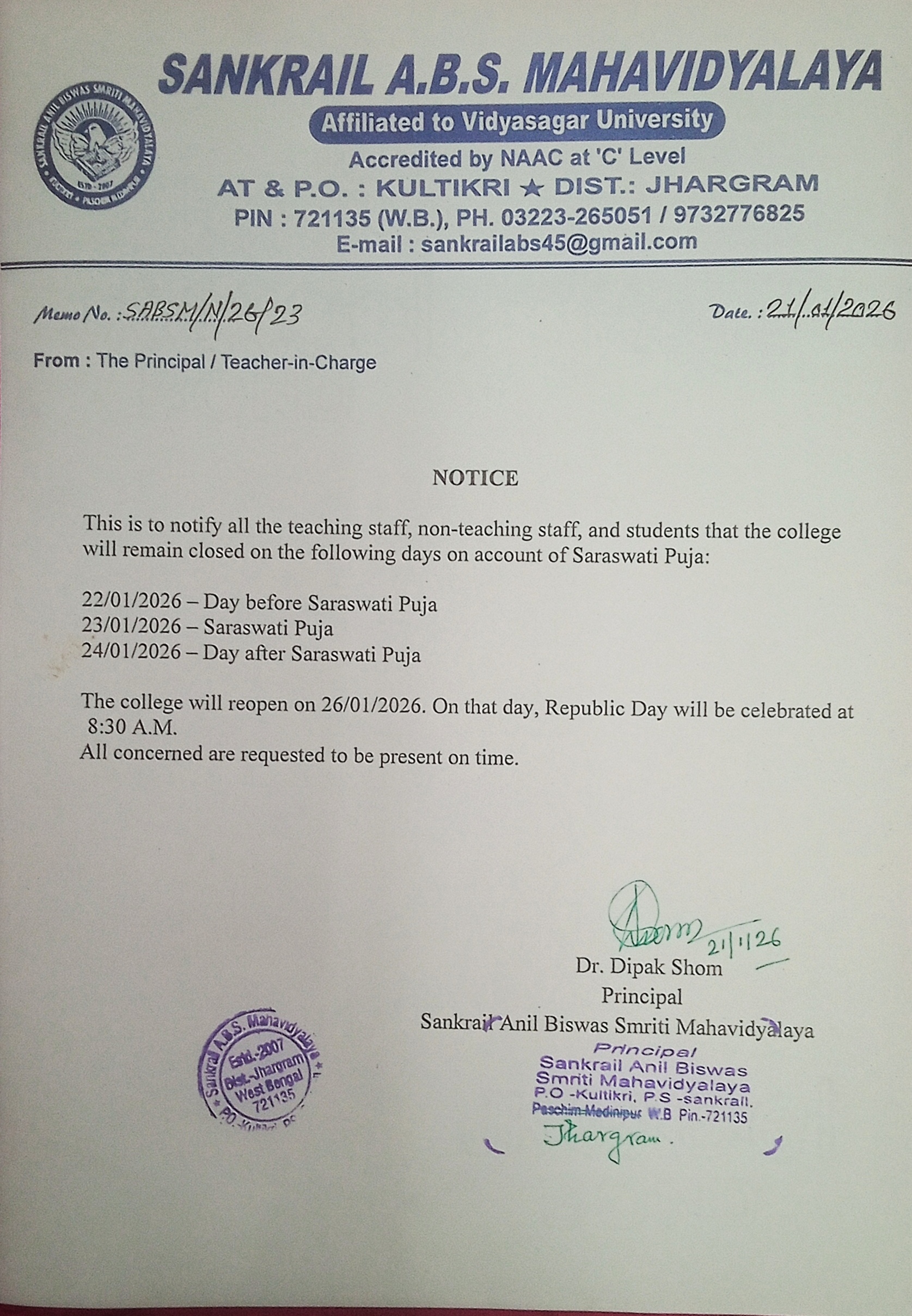 Sankrail Anil Biswas Smriti Mahavidyalaya, situated in the verdant village of Kultikri, Jhargram, West Bengal, is a NAAC-accredited institution affiliated with Vidyasagar University. Established in 2007, the college was founded with a mission to provide accessible, quality higher education to first-generation learners, particularly from Scheduled Castes, Scheduled Tribes, and Other Backward Classes in the Jungle Mahal region. Named after the esteemed social worker Anil Biswas, the institution embodies a commitment to empowering marginalized communities through academic excellence and holistic development.