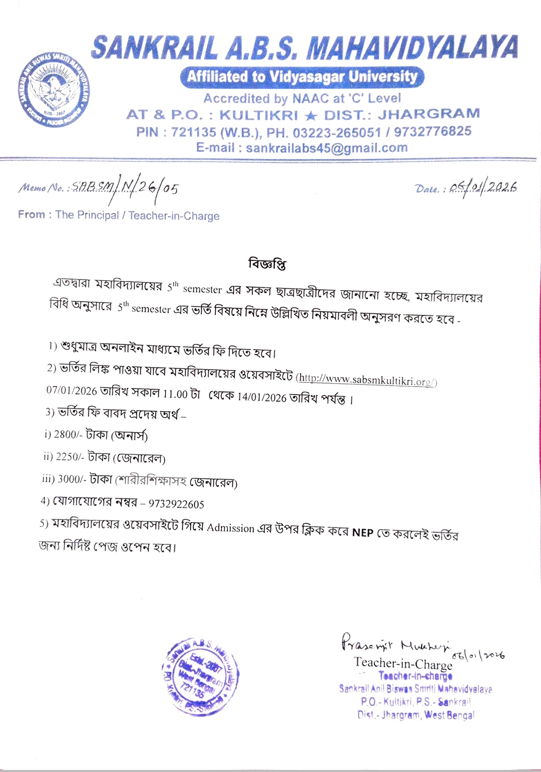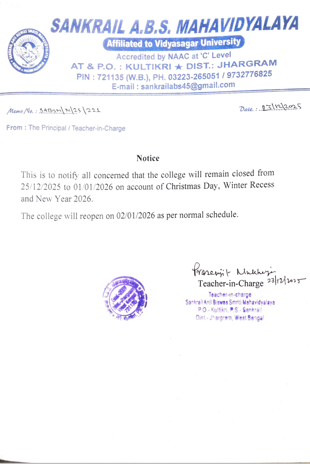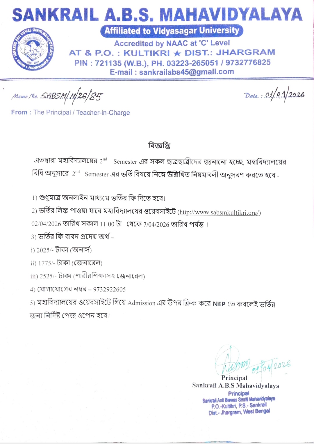 Nestled amidst the natural beauty of Jhargram, the college operates from a sprawling, eco-friendly campus that blends modern infrastructure with a serene learning environment. It offers a diverse range of undergraduate programs in Arts and Science, structured under the Choice-Based Credit System (CBCS) and the National Education Policy (NEP-2020) frameworks. Students can pursue 3-year and 4-year Honours/Honours with Research degrees, as well as multidisciplinary programs, in subjects such as Bengali, English, Sanskrit, History, Political Science, Santali, Education, Physics, Chemistry, Mathematics, Geography, and more.