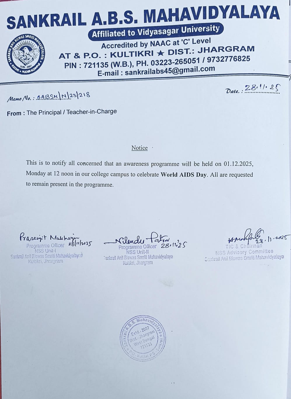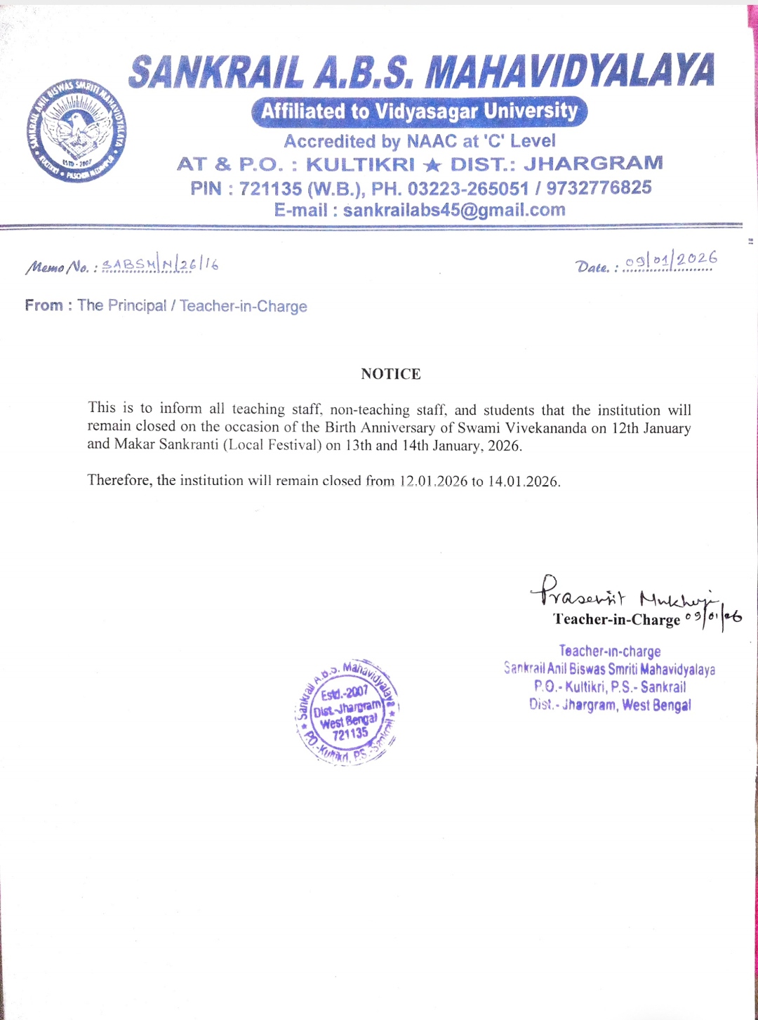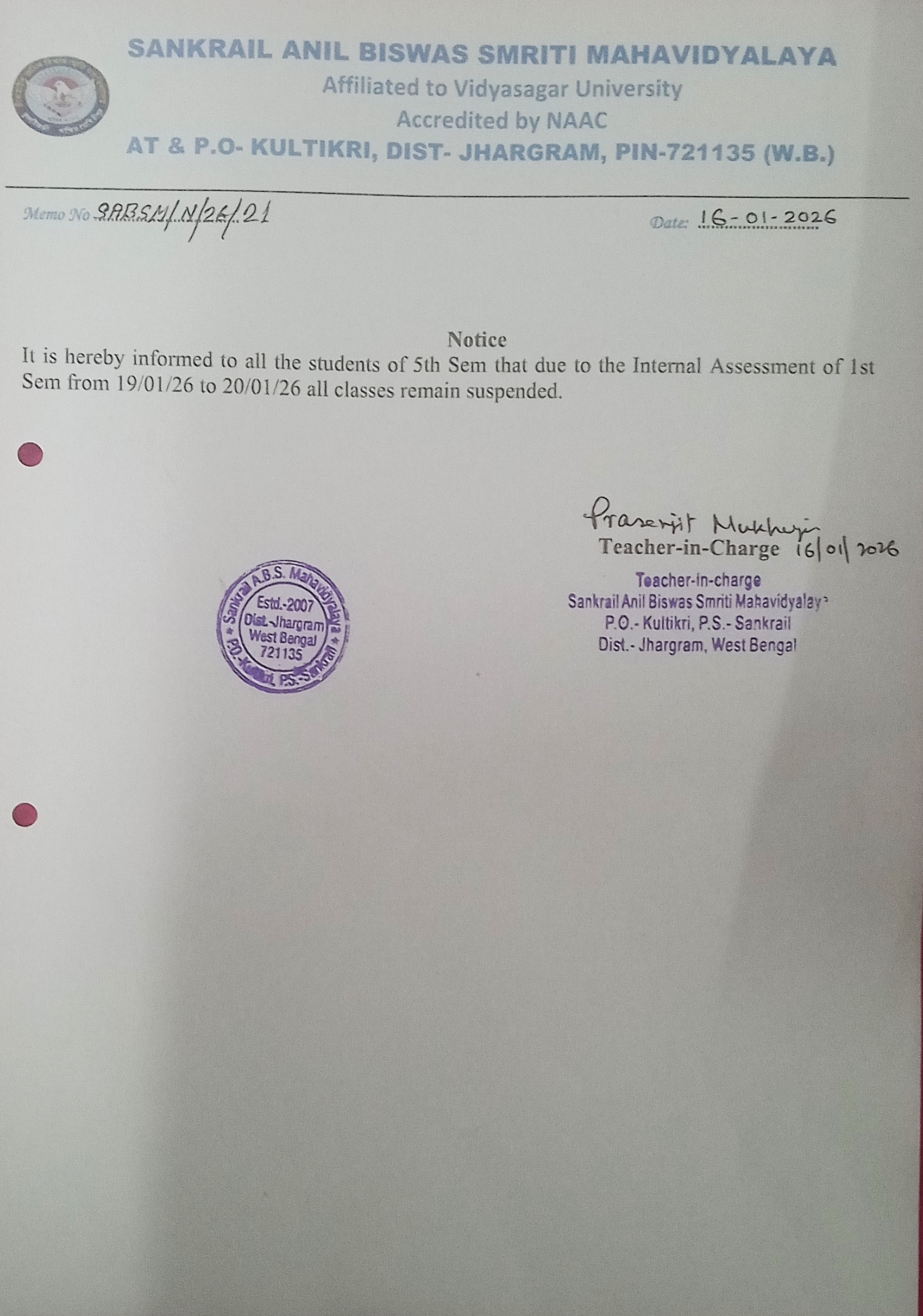 Sankrail Anil Biswas Smriti Mahavidyalaya, situated in the verdant village of Kultikri, Jhargram, West Bengal, is a NAAC-accredited institution affiliated with Vidyasagar University. Established in 2007, the college was founded with a mission to provide accessible, quality higher education to first-generation learners, particularly from Scheduled Castes, Scheduled Tribes, and Other Backward Classes in the Jungle Mahal region. Named after the esteemed social worker Anil Biswas, the institution embodies a commitment to empowering marginalized communities through academic excellence and holistic development.
