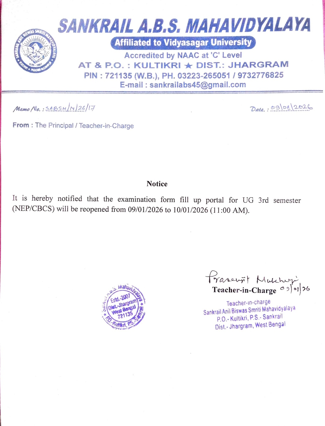 Nestled amidst the natural beauty of Jhargram, the college operates from a sprawling, eco-friendly campus that blends modern infrastructure with a serene learning environment. It offers a diverse range of undergraduate programs in Arts and Science, structured under the Choice-Based Credit System (CBCS) and the National Education Policy (NEP-2020) frameworks. Students can pursue 3-year and 4-year Honours/Honours with Research degrees, as well as multidisciplinary programs, in subjects such as Bengali, English, Sanskrit, History, Political Science, Santali, Education, Physics, Chemistry, Mathematics, Geography, and more.